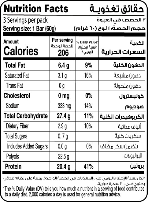 Ingredients: Protein Blend (Soy, Pea, Spirulina), Humectants [Glycerol (Plant Origin), Maltitol Syrup], Sweetener (Erythritol, Maltitol), Peanut Butter, Non-Hydrogenated Vegetable Oil (Coconut, Palm), Soy Protein Crisps, Polydextrose, Reduced Fat Cocoa Powder, Salt, Cocoa Mass, Modified Corn Starch, Stabilizer (Pectin, Xanthan Gum), Emulsifier (Soy Lecithin), Preservative (Potassium Sorbate), Nature Identical Flavours (Vanilla, Peanut). Allergens: Contain soy and peanuts.