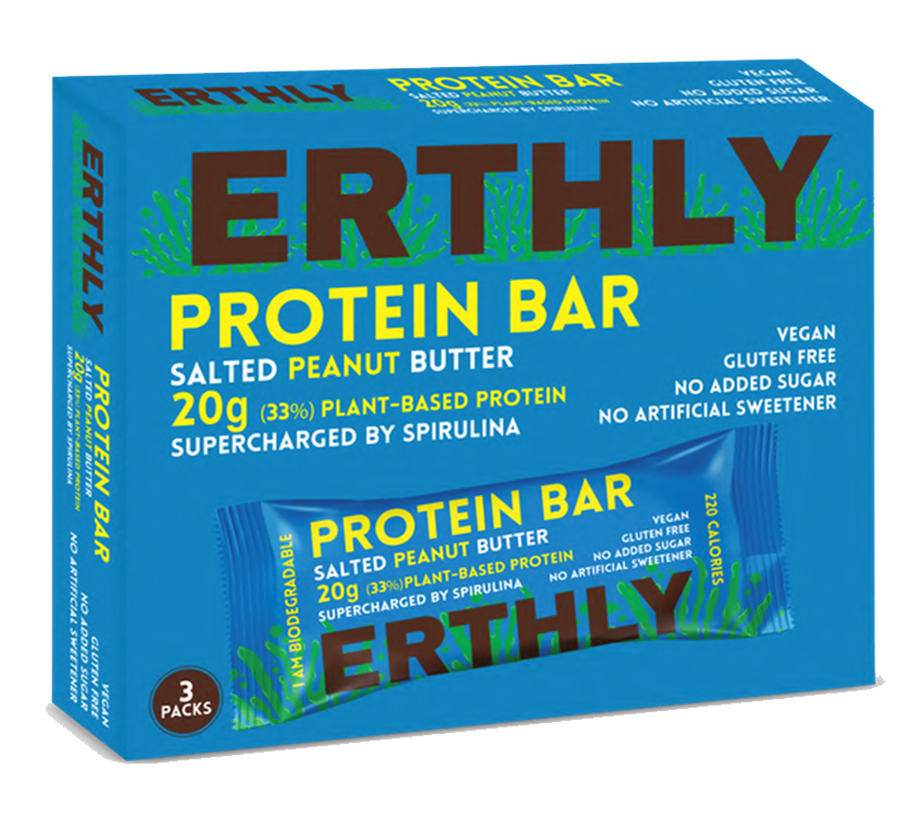 Introducing our Salted Peanut Butter ERTHLY Bar! This plant-based protein bar is a powerhouse, boasting 20g of protein, thanks to the addition of superfood Spirulina. Gluten-free, vegan, and free from added sugar or artificial sweeteners, it's a guilt-free indulgence at just 227 calories per serving. Packaged in 100% biodegradable materials, it reflects our commitment to sustainability. Affordable and nutritious, it's designed to ensure everyone can meet their daily protein needs. Treat yourself to the perfect blend of flavor and nutrition with our Salted Peanut Butter Erthly Bar!