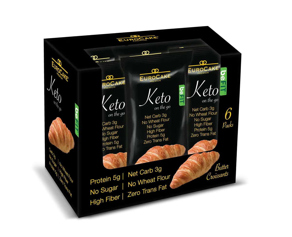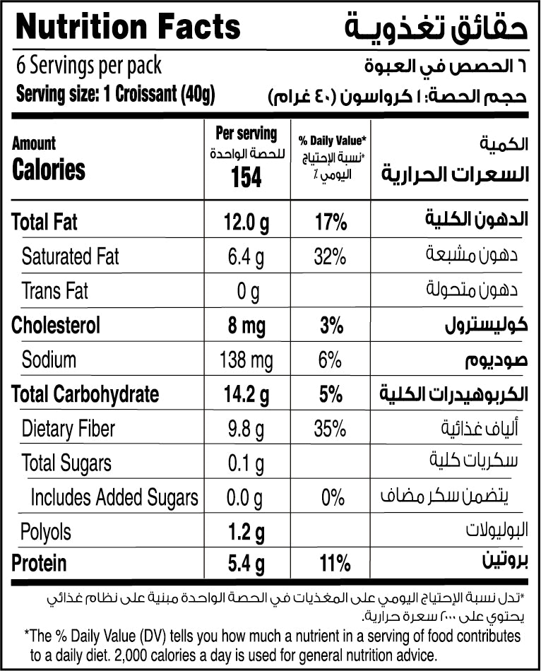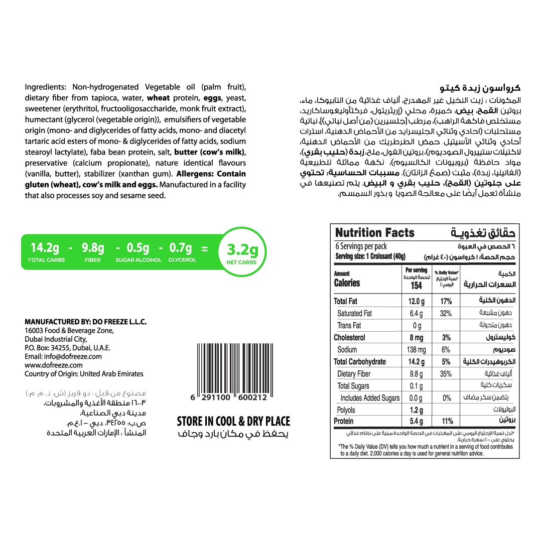 Ingredients: Non-hydrogenated Vegetable oil (palm fruit), dietary fiber from tapioca, water, wheat protein, eggs, yeast, sweetener (erythritol, fructooligosaccharide, monk fruit extract), humectant (glycerol (vegetable origin)), emulsifiers of vegetable origin (mono- and diglycerides of fatty acids, mono- and diacetyl tartaric acid esters of mono- & diglycerides of fatty acids, sodium stearoyl lactylate), faba bean protein, salt, butter (cow’s milk), preservative (calcium propionate), nature identical flavours (vanilla, butter), stabilizer (xanthan gum). Allergens: Contain gluten (wheat), cow’s milk and eggs. Manufactured in a facility that also processes soy and sesame seed.