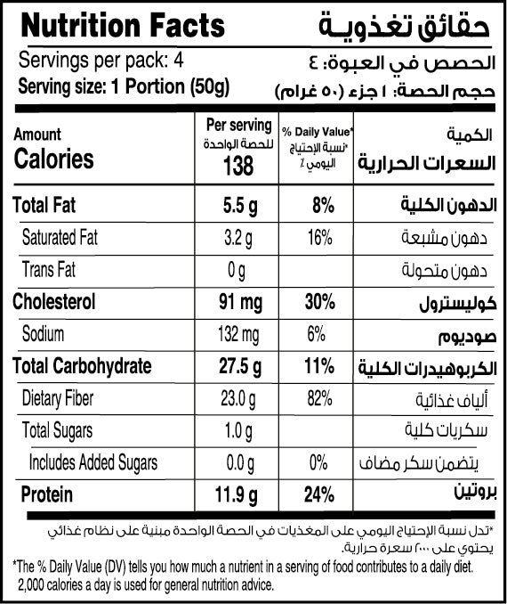 Ingredients: Dietary fiber from tapioca, eggs, gluten-protein, coconut oil, salt, faba bean protein, emulsifier from vegetable origin (mono- & diglycerides of fatty acids). Allergens: Contain gluten (wheat) and eggs. Manufactured in a facility that also processes soy and milk.